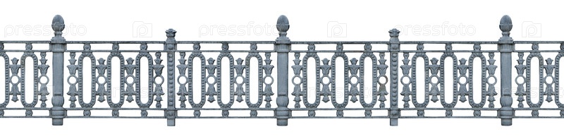 Длинный сегмент металлического забора с отделкой, изолированный на белом фоне (элемент дизайна)
