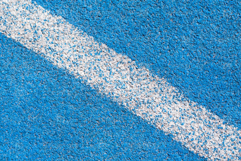 Закрыть вид на синюю синтетическую поверхность тартана трассы легкоатлетического стадиона с белой диагональной линией в виде текстуры, фона (абстракт)