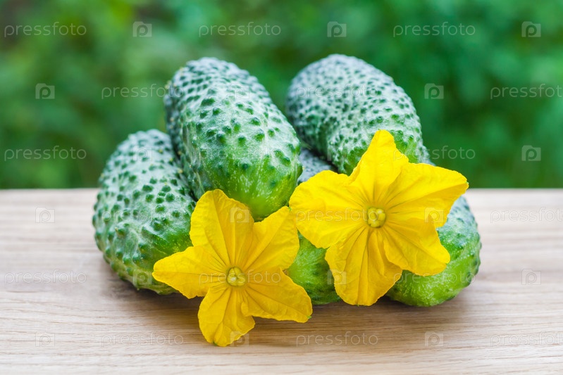 Вид на груду свежих огурцов с желтыми цветами на деревянной доске на фоне зеленого сада в боке (небольшая глубина резкости)