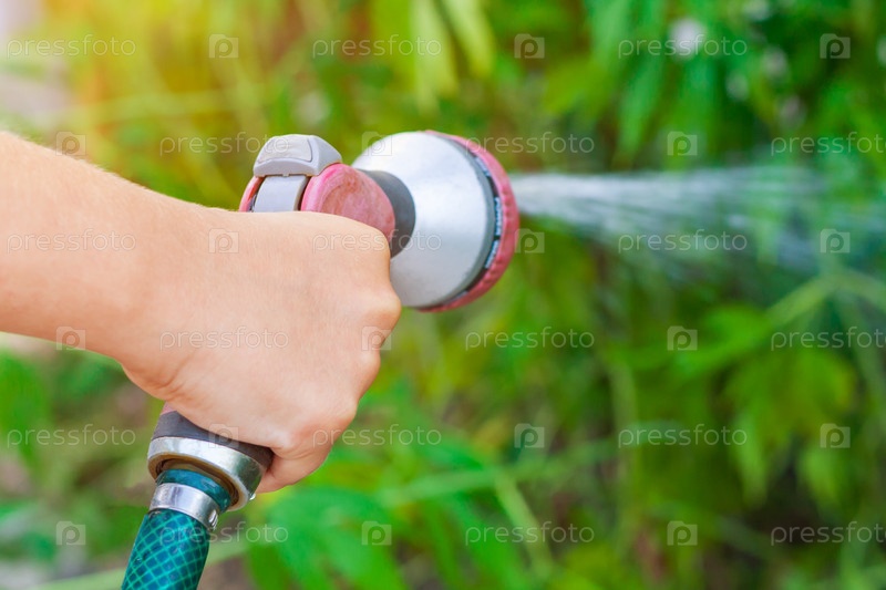 Закрыть вид на мужскую руку с помощью спринклера, поливая огород на фоне зеленых растений в боке, освещенных солнечным светом (медленная глубина резкости, тонированная)