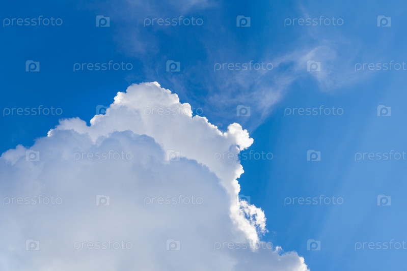 Белые кучевые пушистые облака в ярко-синем небе