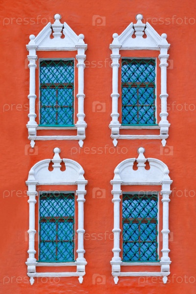 Вид на фасад древнего красного здания с четырьмя окнами с резными белыми каменными пластинами в виде текстуры (вертикальная ориентация)