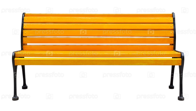 Красочная деревянная скамейка окрашена в оранжевый цвет с металлическими ножками, изолирована на белом фоне (элемент дизайна)