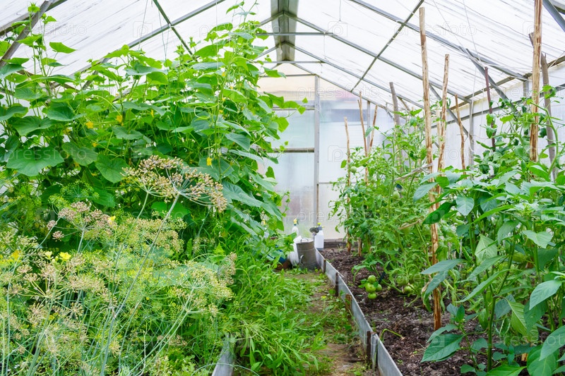 Общий вид на небольшую крытый теплицу с выращиванием: огурцы, помидоры, горячий перец, укроп, аругула