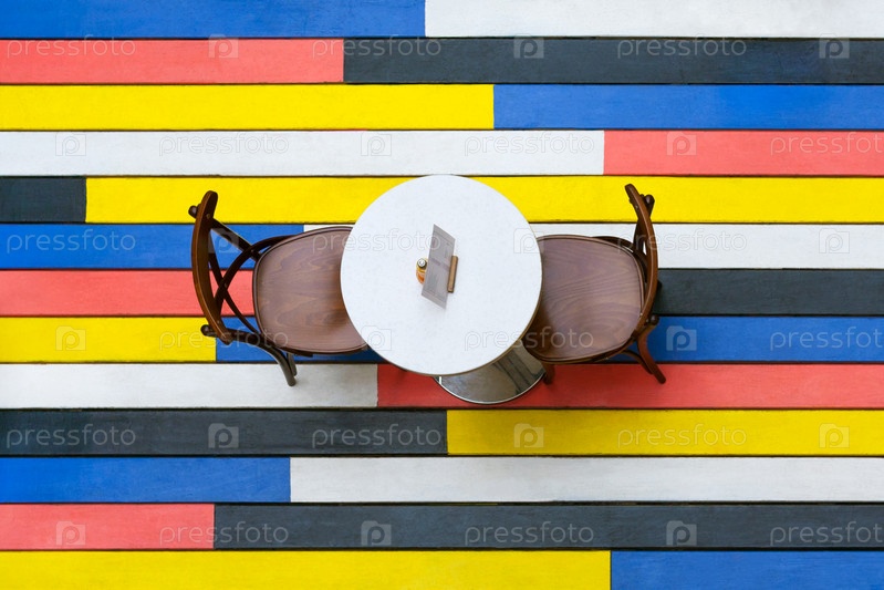 Вид сверху на круглый стол и стулья на разноцветном деревянном полу в кафе