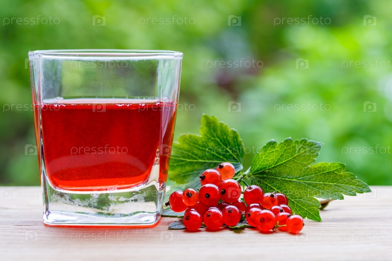 Стакан с красным соком смородины и ветка ягод с листьями на деревянном столе на фоне зеленого сада в боке с копировальным пространством (небольшая глубина резкости)