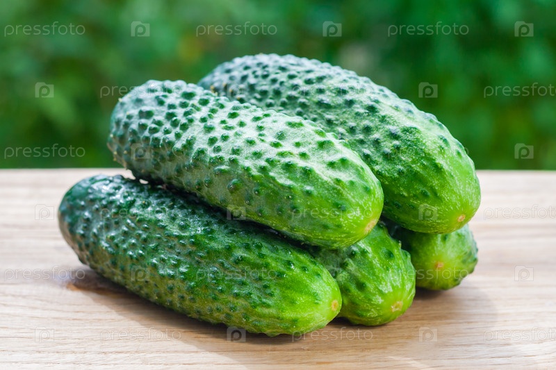 Закрыть вид на груду свежих огурцов на деревянном столе на фоне зеленого сада в боке (небольшая глубина резкости)