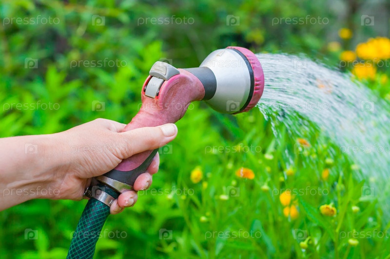 Женская рука с спринклером, поливающим желтые цветы в зеленом саду (небольшая глубина резкости)