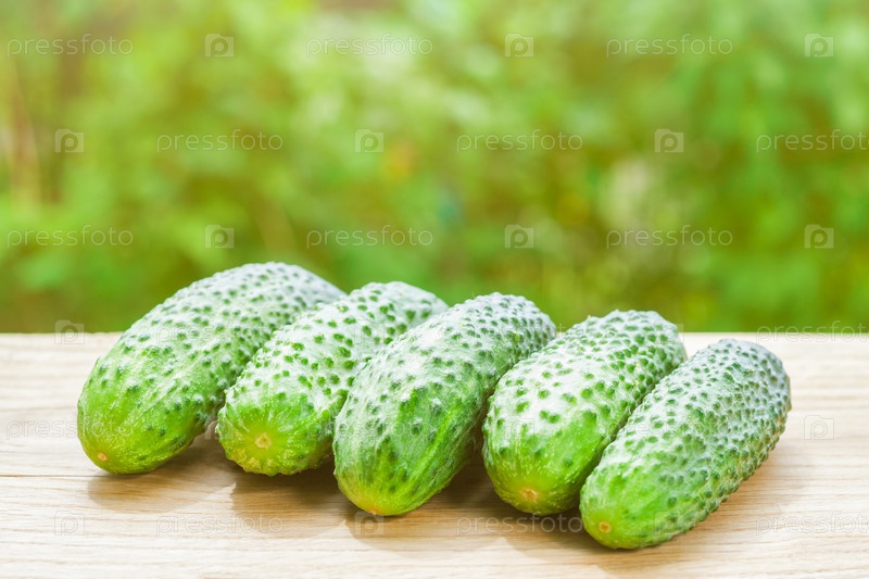 Вид на ряд свежих огурцов на деревянной доске на фоне зеленого сада в размытии, освещенный солнечным светом с копировальным пространством (тонированный)