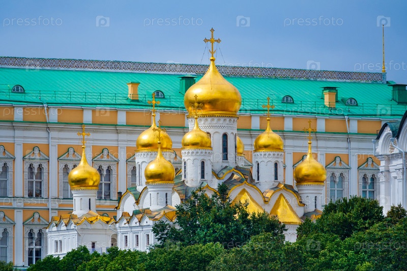 Благовещенский собор Московского Кремля с золотыми куполами на фоне Большого Кремлевского дворца