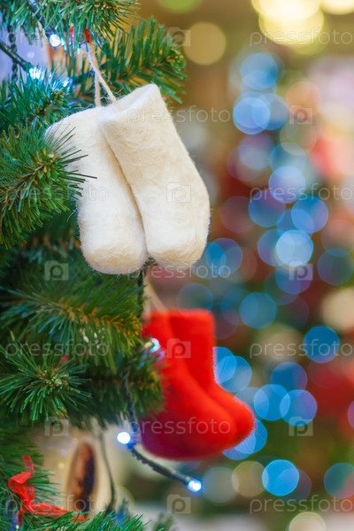 Закрыть вид на красно-белые войлочные сапоги на рождественской елке на фоне свечения в боке (небольшая глубина резкости)