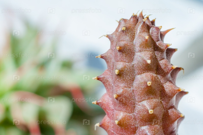 Закрыть вид на хуернию - сочное растение на фоне размытого сада (копировать пространство)