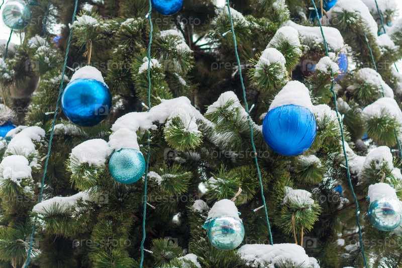 Вид на голубые шары на рождественской елке, покрытой снегом