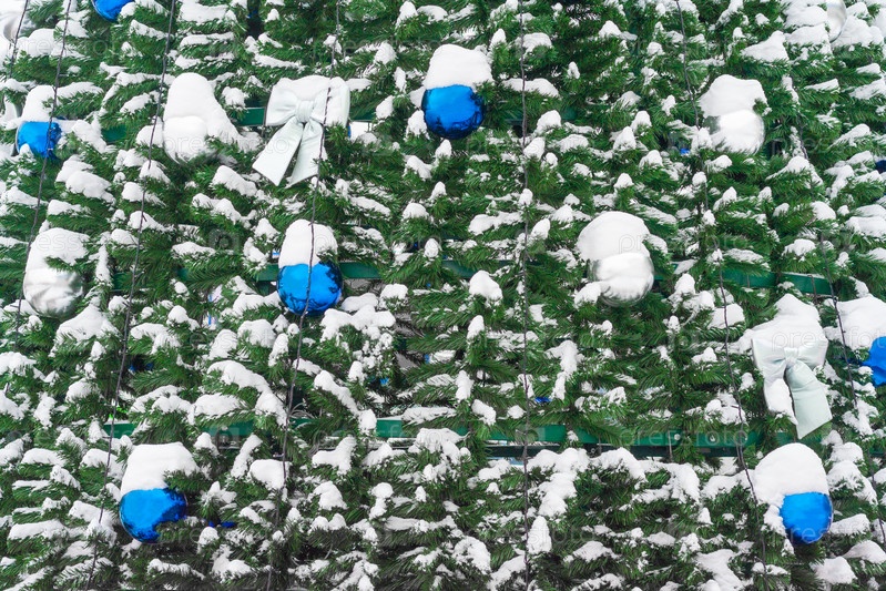 Синие и серебряные шары, луки на рождественской елке, покрытой снегом