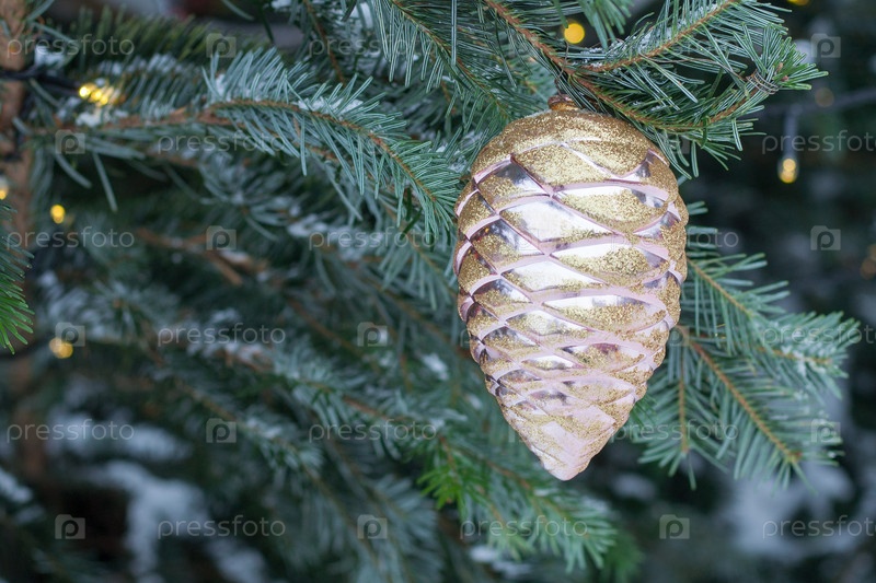 Вид на игрушку с сосновым конусом на рождественской елке (небольшая глубина резкости)