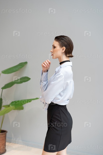 Молодая красивая женщина позирует в синей рубашке в студии