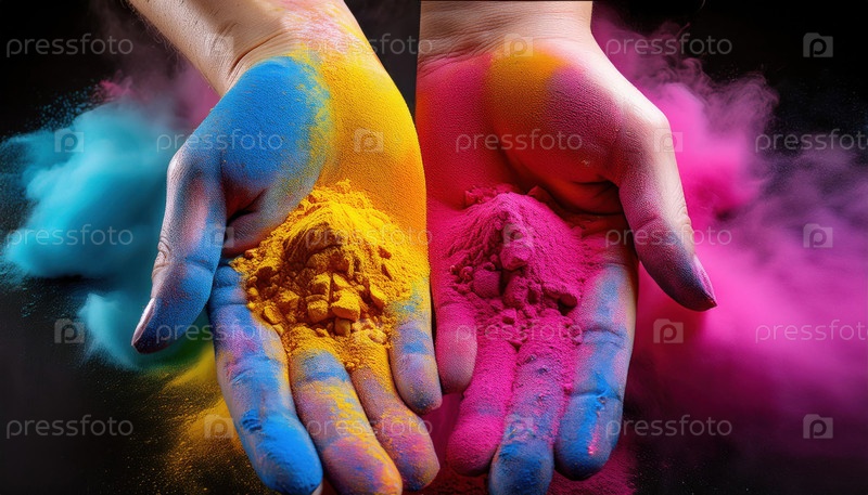 Руки, держащие красочные порошки на темном фоне, победа добра над злом, начало весеннего сезона урожая и торжество любви. Холи всемирно известный индуистский фестиваль цветов