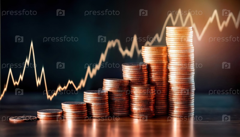Стек медных монет, расположенных в порядке возрастания с растущим финансовым графиком на заднем плане