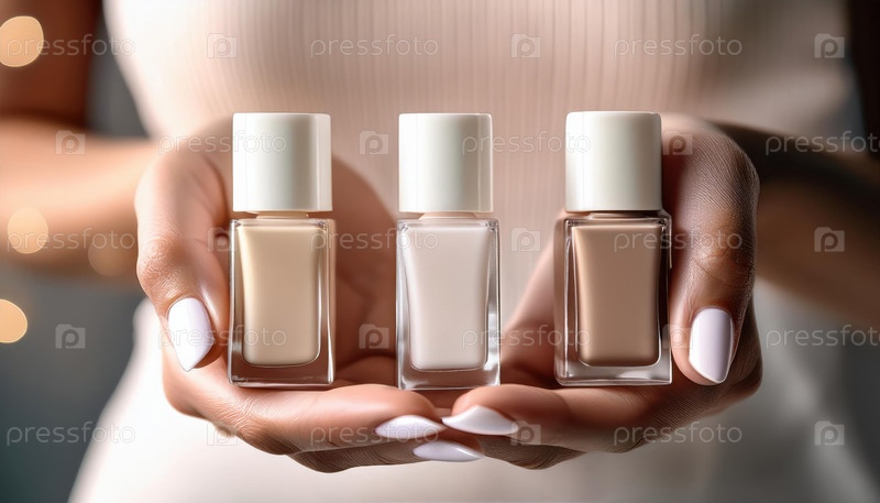 Три бутылки макияжа Mocha Mousse с маникюрными ногтями и размытым фоном