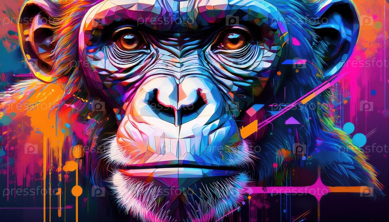 Красочная геометрическая цифровая живопись лица шимпанзе с яркими оттенками и абстрактными элементами