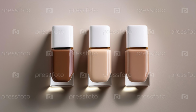 Три элегантные бутылки фундамента в градиентных оттенках, представляющие разнообразие в ассортименте косметической продукции. Моча Муссовый цвет