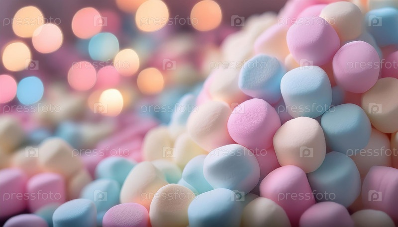 Мягкое фокусное изображение пастельных мини-маршалло с красочными боке-светами, вызывающими мечтательную сладкие конфеты