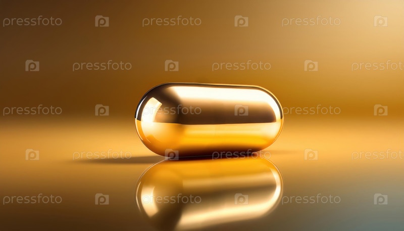 Золотая капсульная таблетка, отражающая свет на градиентном желтом фоне для роскошной медицинской темы
