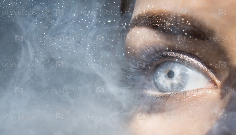 Замкнутый глаз с голубой радужкой, окруженный туманом и сверкающими частицами в мечтательной художественной концепции. Вредное воздействие курения на здоровье и окружающую среду
