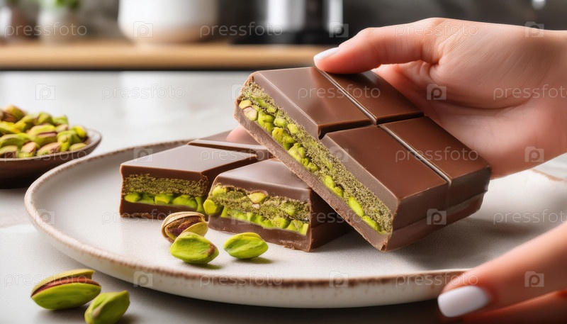 Вкусный шоколадный батончик dubai с фисташковой и кнафеховой начинкой подается на тарелке с целыми фисташками в качестве украшения