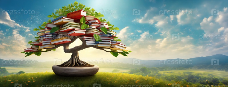 Дерево с книгами, как листья, стоящее на травянистом холме. День любителей книг. Панорама с пространством для копирования