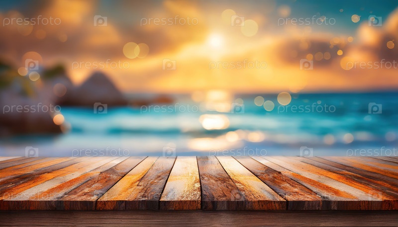 Безмятежный вид на закат на тропическом пляже с деревянными досками на переднем плане, океанскими волнами и размытым эффектом боке на заднем плане