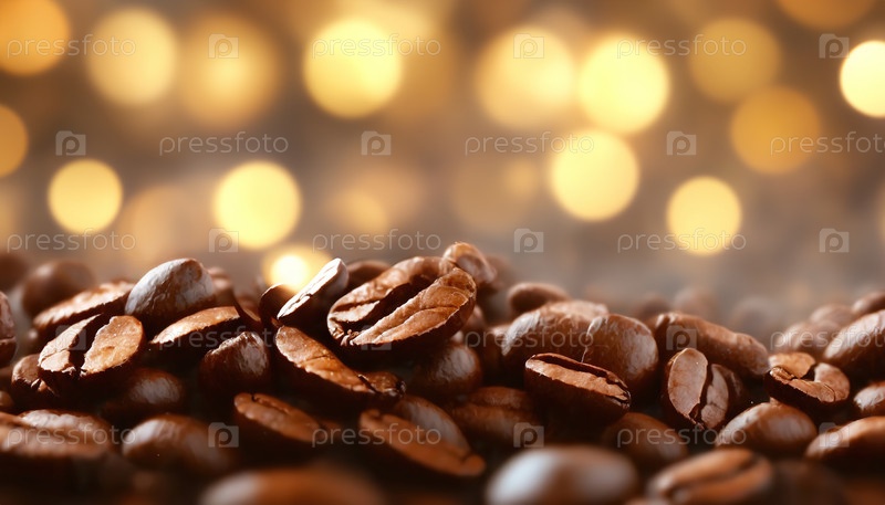 Крупный план жареных кофейных зерен, расположенных в теплом окружающем свете с золотыми эффектами боке, подчеркивая свежесть и аромат для любителей кофе. Международный день кофе