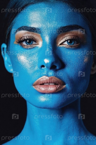 Генеративное женское лицо, покрытое синей глянцевой краской, крупный план женской рекламы красоты