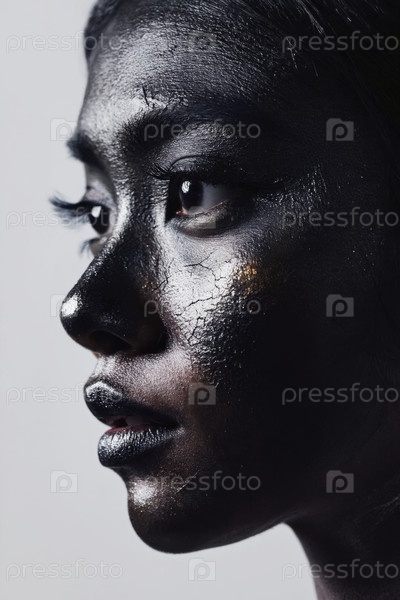 Генеративное женское лицо, покрытое черной глянцевой краской, крупный план женской рекламы красоты