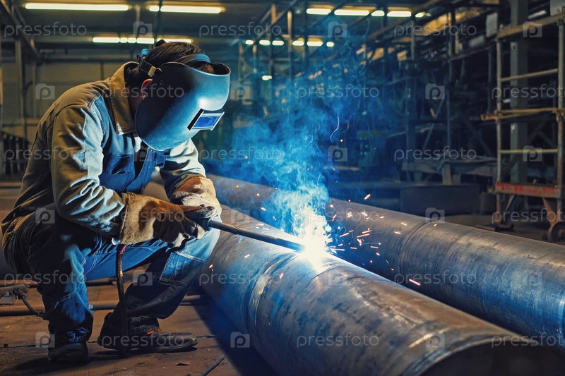 Generative Man сварщик, занимающийся сваркой на большой трубе, рабочий на мануфактуре AI