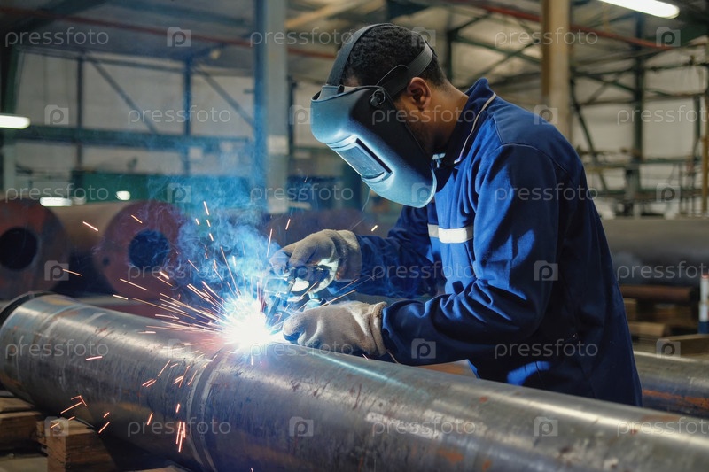 Generative Man сварщик, занимающийся сваркой на большой трубе, рабочий на мануфактуре AI