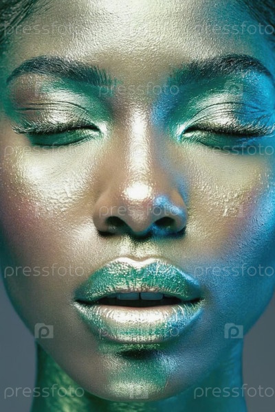 Генеративное женское лицо, покрытое зеленой глянцевой краской, крупный план женской рекламы красоты