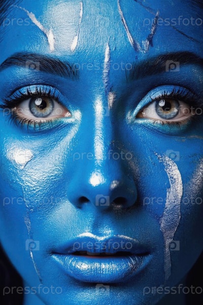 Генеративное женское лицо, покрытое синей глянцевой краской, крупный план женской рекламы красоты