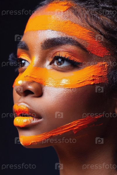 Генеративное женское лицо, покрытое оранжевой глянцевой краской, крупный план женской рекламы красоты