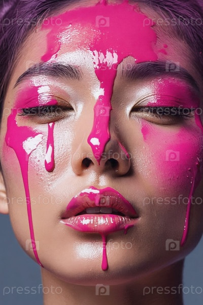 Генеративное женское лицо, покрытое розовой глянцевой краской, крупный план женской рекламы красоты
