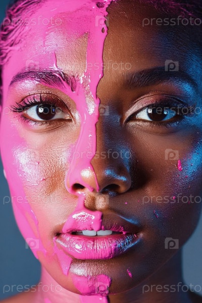 Генеративное женское лицо, покрытое розовой глянцевой краской, крупный план женской рекламы красоты