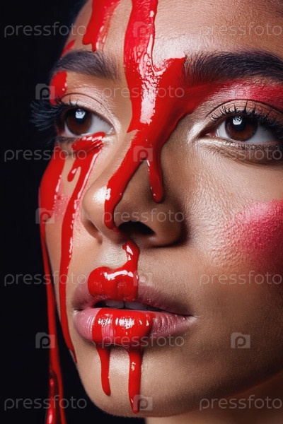 Генеративное женское лицо, покрытое красной глянцевой краской, крупный план женской рекламы красоты