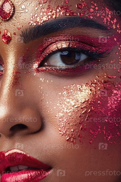 Генеративное женское лицо, покрытое красной глянцевой краской, крупный план женской рекламы красоты