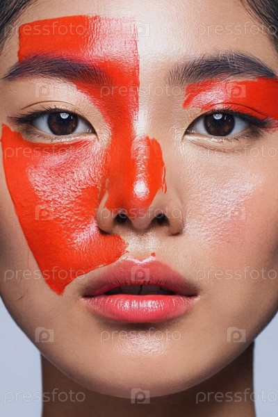 Генеративное женское лицо, покрытое красной глянцевой краской, крупный план женской рекламы красоты