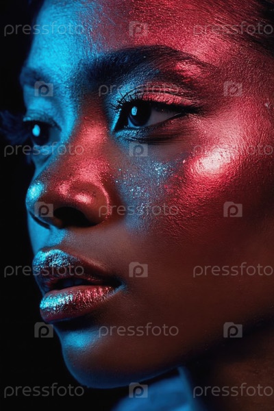 Генеративное женское лицо, покрытое красной глянцевой краской, крупный план женской рекламы красоты