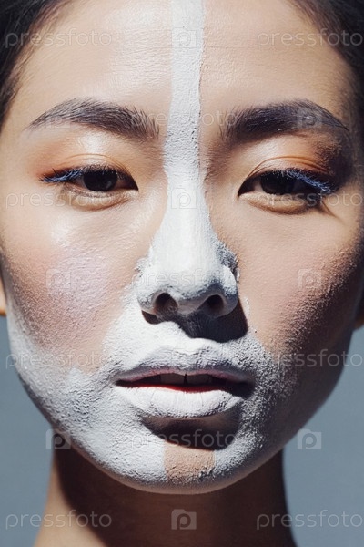 Генеративное женское лицо, покрытое белой глянцевой краской, крупный план женской рекламы красоты