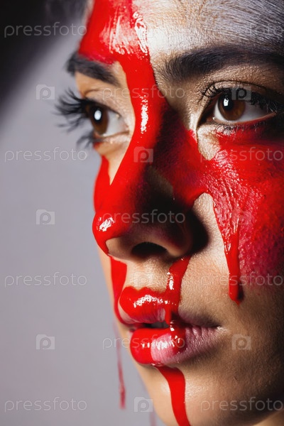 Генеративное женское лицо, покрытое красной глянцевой краской, крупный план женской рекламы красоты