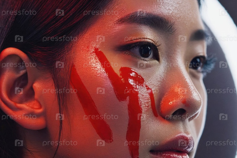 Генеративное женское лицо, покрытое красной глянцевой краской, крупный план женской рекламы красоты
