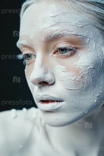 Генеративное женское лицо, покрытое белой глянцевой краской, крупный план женской рекламы красоты
