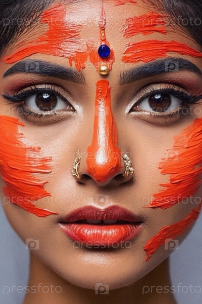 Генеративное женское лицо, покрытое красной глянцевой краской, крупный план женской рекламы красоты